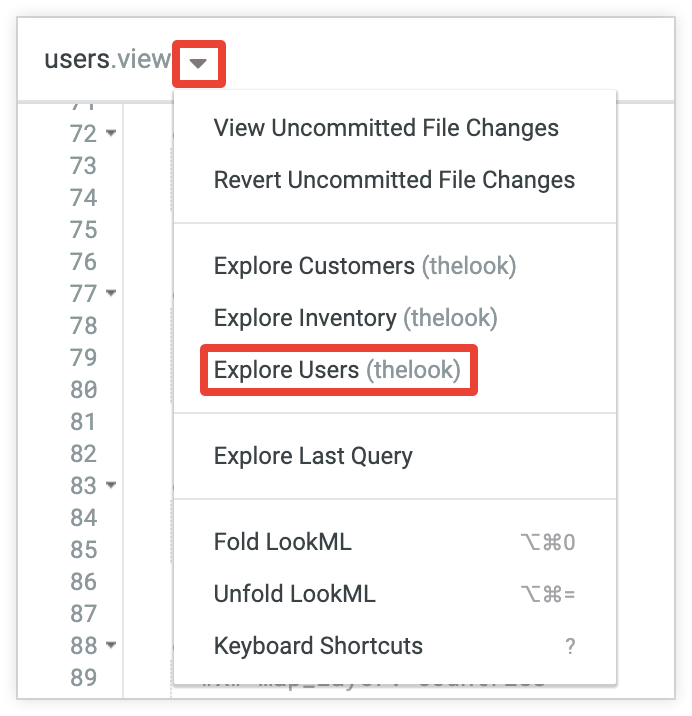 You can test your new dimension and measure by querying them. After you save your changes, these fields will appear in the field picker in the Explore. Use the See file actions drop-down menu next to the view filename to access the Explore for the current view. The See file actions drop-down menu lists any Explores that are based on the view, including Explores that the view is joined to. As an example, to access the Explore for a view called users, you can select the Explore Users option from the See file actions drop-down menu.