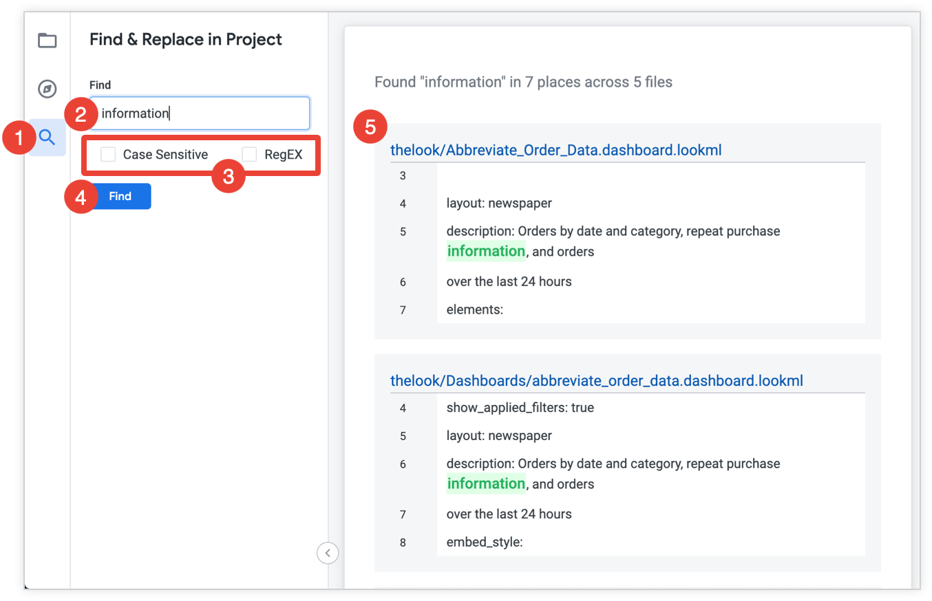 To use the Looker IDE find function, follow these steps: