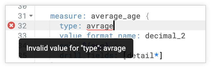 The IDE catches syntax errors as you type. A red X in the gutter indicates a syntax error, which is underlined in red. When you hold the cursor over the red X, a short description of the problem appears. For example, if you mistakenly type avrage instead of average as the value of the type parameter for a measure, the IDE displays the error Invalid value for "type":avrage.