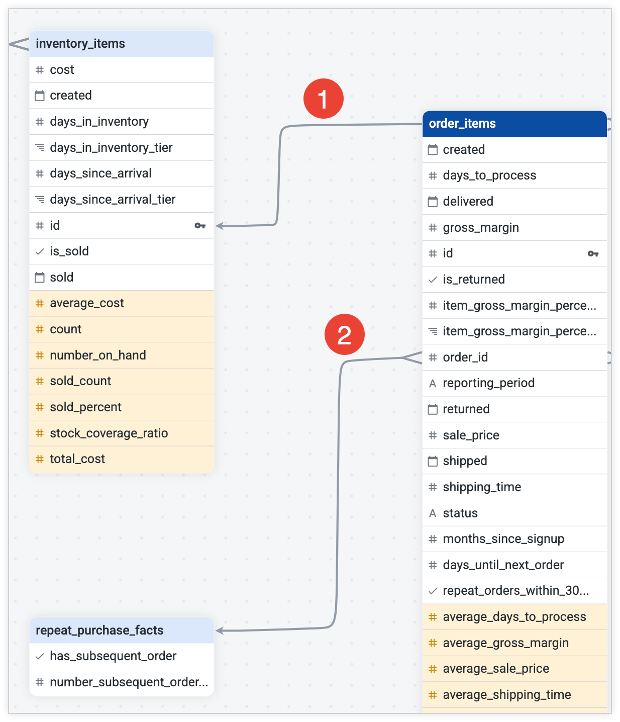 1. Join satu-ke-satu dari order_items ke inventory_items, yang bergabung di kolom id