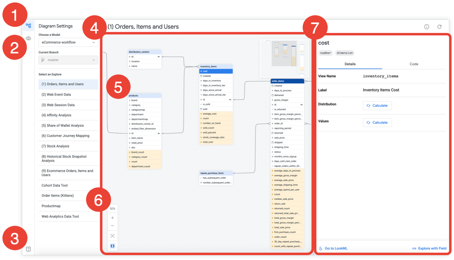 4. Kanvas diagram untuk berinteraksi dengan objek LookML di Jelajah yang dipilih