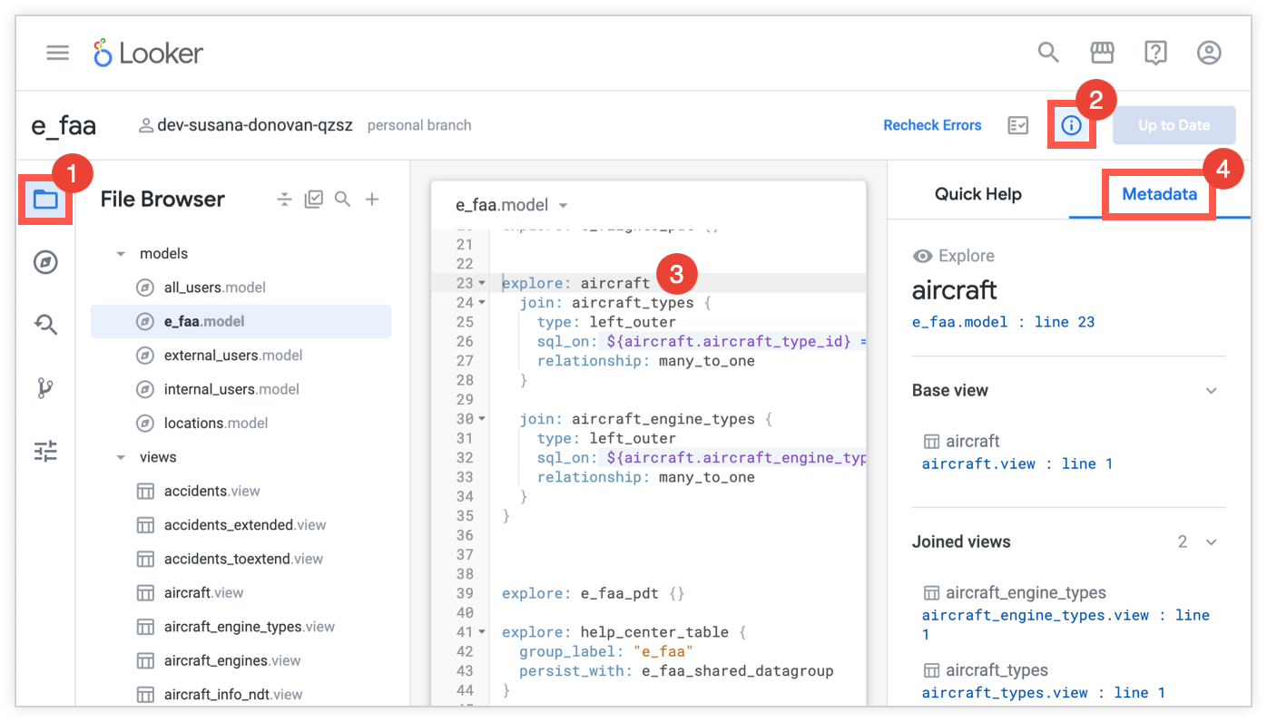 Users who have develop permission can view contextually relevant information about the objects in the Looker IDE metadata panel.