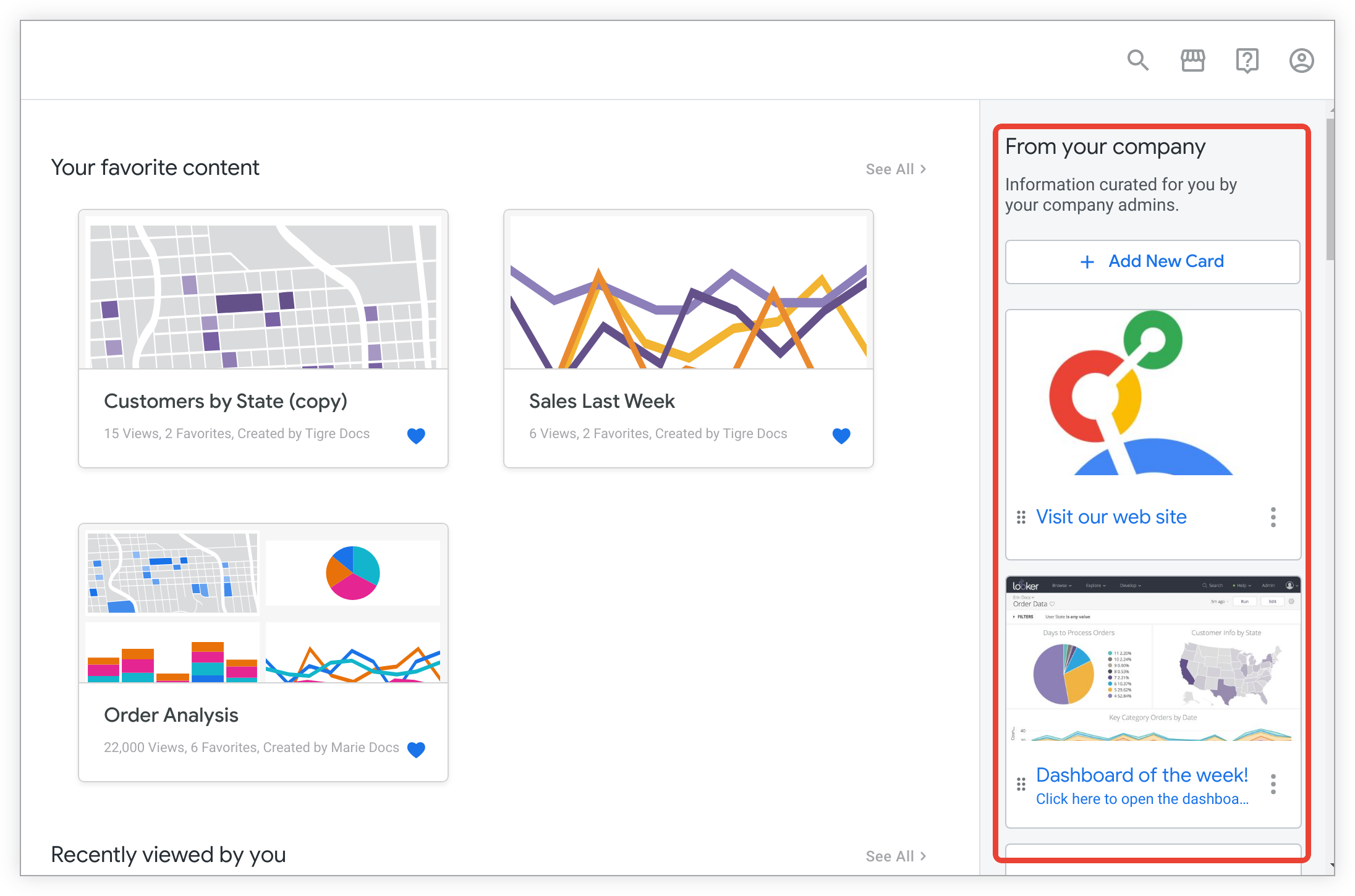 会社で Looker のビルド済みホームページを使用している場合、管理者または manage_homepage 権限を持つユーザーは、右側の告知サイドバーですべての Looker ユーザーとテキスト、リンク、画像を共有できます。