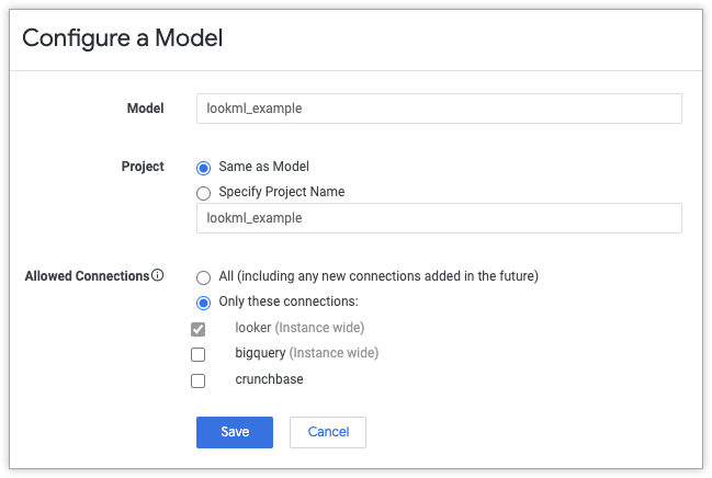 If the model does not have a configuration, when you click Configure, Looker displays the Configure a Model window. In the Configure a Model window, you can specify the model name, the project name, and the connections that are available to the model.