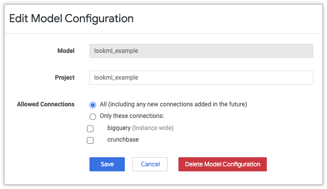 If the model does not have a configuration, when you click Configure, Looker displays the Configure a Model window. In the Configure a Model window, you can specify the model name, the project name, and the connections that are available to the model.