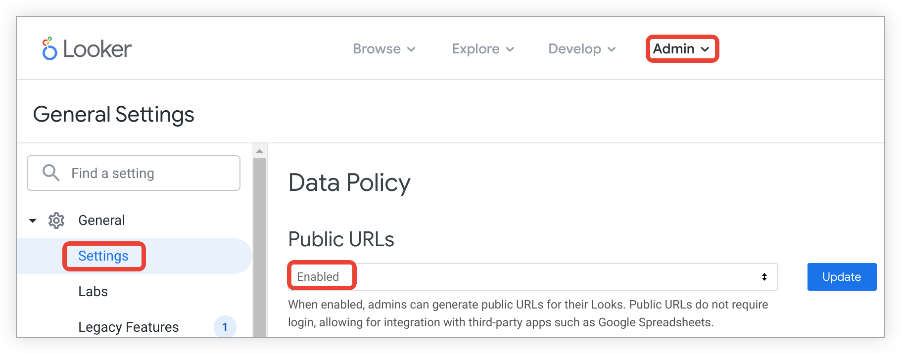 Consider the security implications of this feature before enabling it. Although the URLs that Looker generates can't be guessed or searched, anyone with the URL can see the data. Anyone who receives the URL could share it with another person who was not intended to have access to your data. You should determine the privacy requirements of the data in question, evaluate your level of trust in anyone who receives a public URL, and clearly establish your expectations about whether — and, if so, how and with whom — it is to be shared.