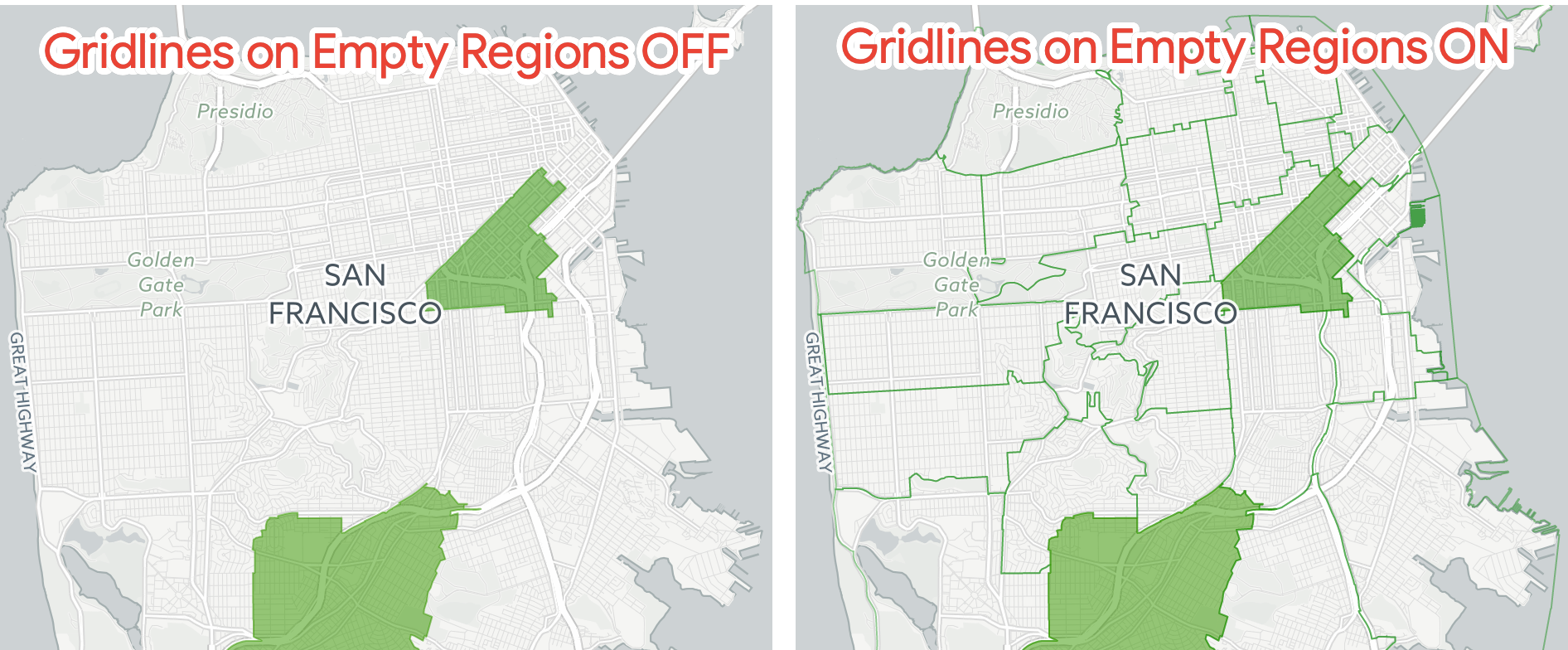 Wenn die Option Heatmap-Gitternetzlinien aktiviert ist und Sie eine Dimension darstellen, für die ein map_layer_name definiert ist, können Sie die Ein/Aus-Schaltfläche Gitternetzlinien für leere Regionen aktivieren, um eine Umrisslinie um die Kartenregionen ohne zugehörige Daten zu zeichnen.