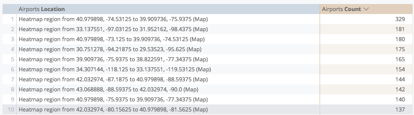 La mappa termica Automagic eseguirà nuovamente una query sui dati per creare la griglia della mappa termica. Una dimensione località in genere mostra punti distinti con una coordinata di latitudine/longitudine, ma quando utilizzi una mappa termica, la dimensione cambia in rettangoli di selezione ("Regione mappa termica da ... a ..") di ogni quadrato della griglia.