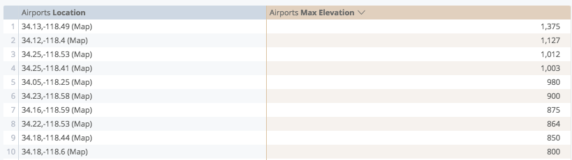 La visualisation de carte Connecter avec des lignes utilise deux champs type:location de votre requête, puis les relie dans la visualisation. L'ajout d'une mesure à la requête vous permet d'ajouter un dégradé de couleurs aux lignes.