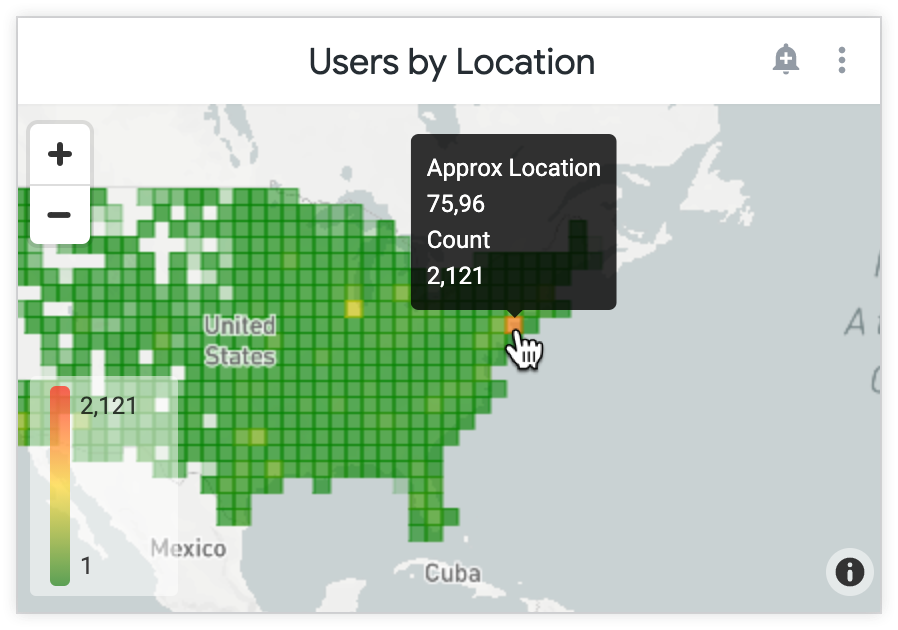 基盤となるクエリのデータをヒートマップ グリッドとして表示できます。これは、表示可能な地図を等しい正方形に分割し、データ内のどの値が各正方形に収まるかを計算することによって機能します。正方形は、選択した measure に応じて色付けされています。このマップをズームインまたはズームアウトすると Looker はグリッドを再計算するため、粒度はズームレベルに適したものになります。