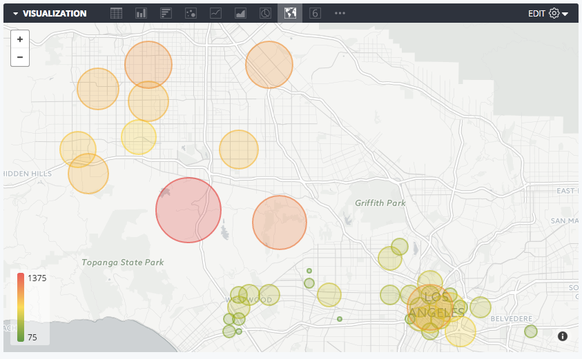 기본 쿼리의 데이터를 히트맵 그리드로 표시할 수 있습니다. 표시되는 지도를 동일한 제곱으로 나눈 후 각 정사각형에 맞는 데이터 값을 계산하는 방식으로 작동합니다. 정사각형은 선택한 측정값에 따라 색상이 지정됩니다. 이 지도를 확대하거나 축소하면 확대/축소 수준에 적합한 세분성으로 Looker가 그리드를 재계산합니다.