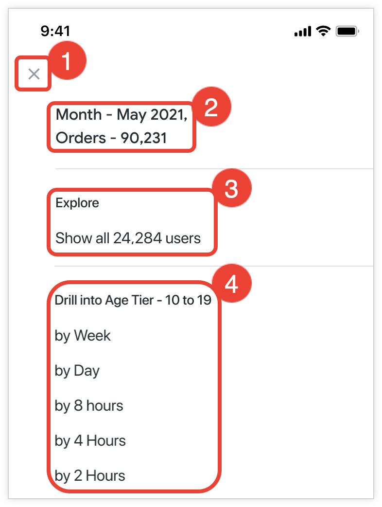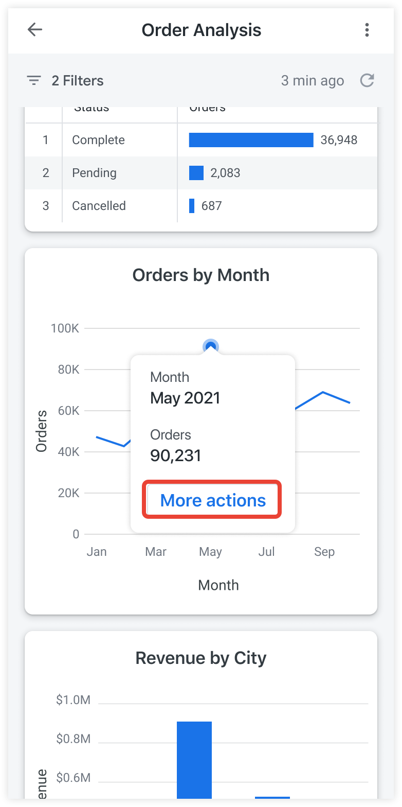 Wenn Sie in der Looker-Webanwendung auf einen Datenpunkt in einer Visualisierung klicken, wird ein Drilldown ausgeführt. Dadurch wird eine weitere Abfrage erstellt, die durch den Datenpunkt verfeinert wird, auf den Sie geklickt haben. So führen Sie einen Drilldown in der mobilen App aus: