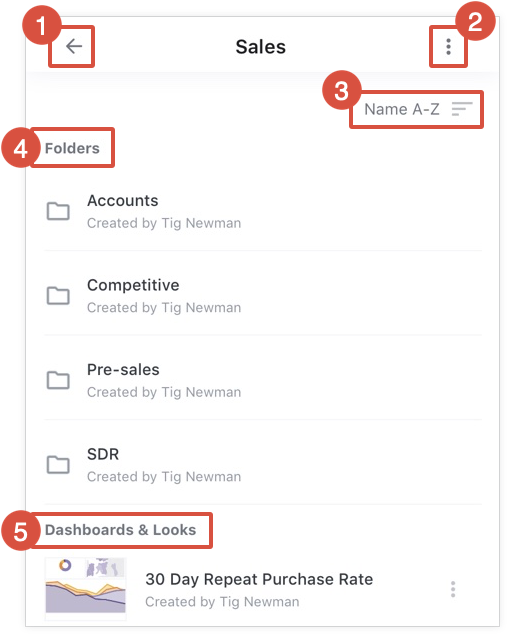 Saat Anda membuka folder di aplikasi seluler Looker, aplikasi akan mencantumkan Look, dasbor, dan subfolder yang disimpan dalam folder tersebut. Anda memiliki opsi berikut ini: