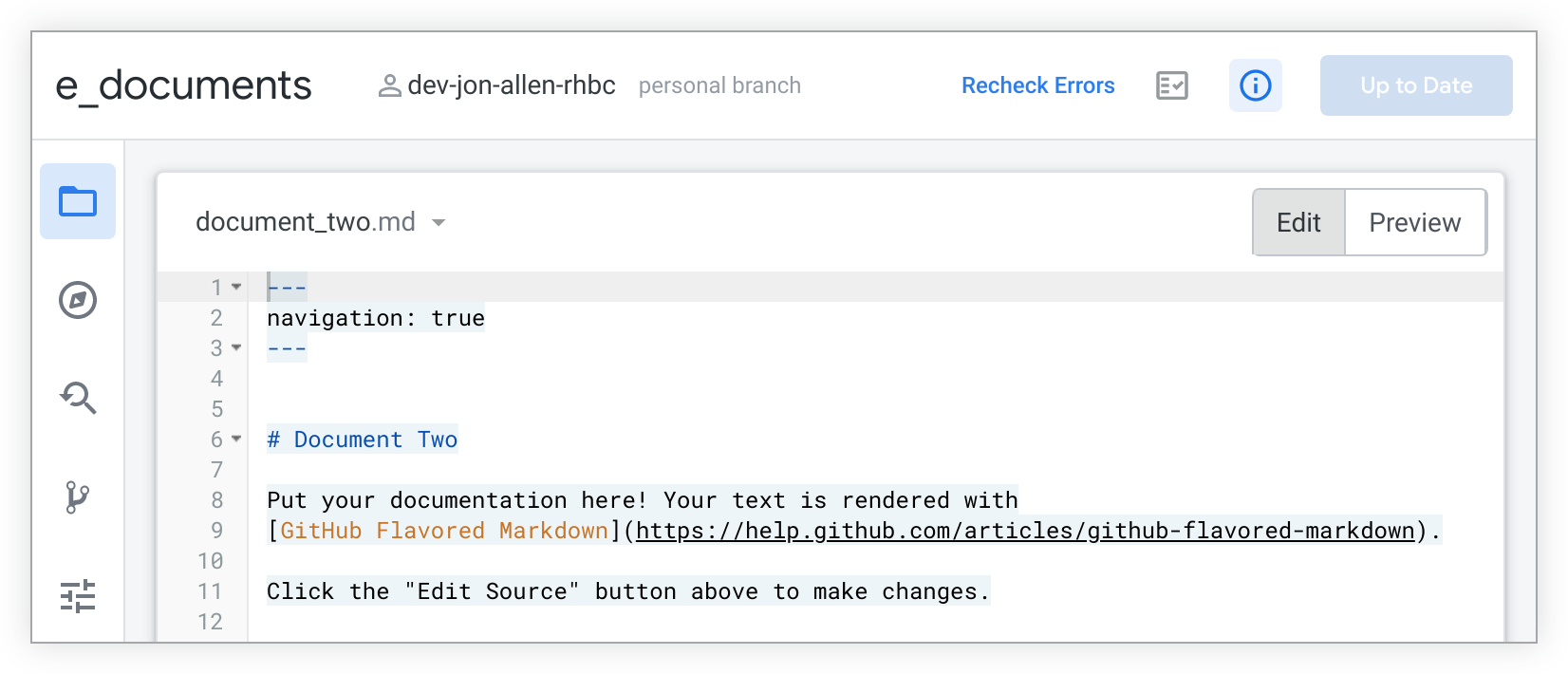 Kode ini menambahkan sidebar navigasi dengan link ke semua dokumen project ke dokumen. Jika Anda hanya menyertakan navigation: true dalam dokumen, sidebar dokumen tersebut akan mencantumkan semua dokumen project dalam urutan abjad berdasarkan nama file.