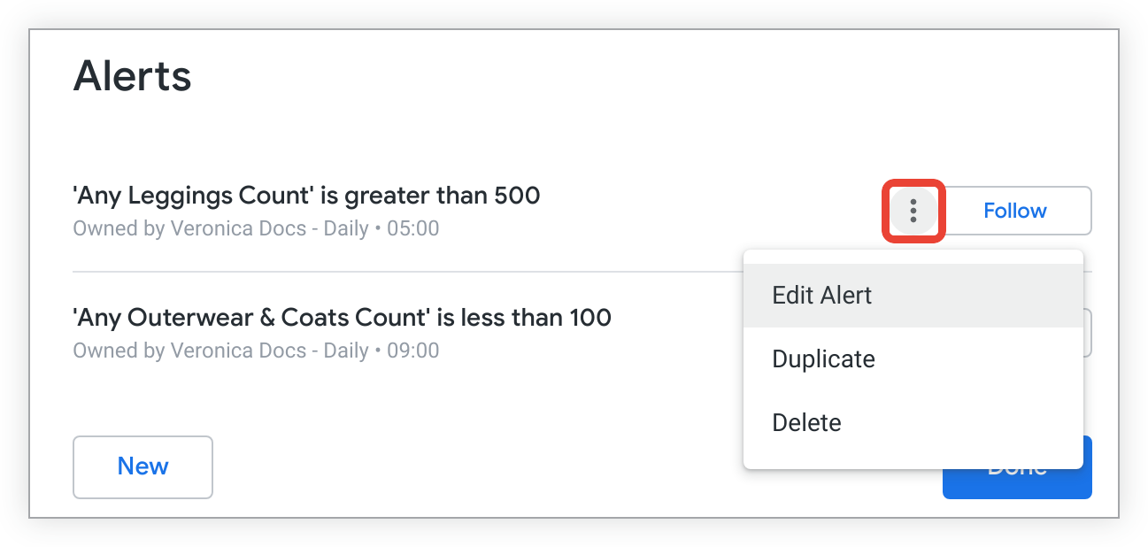 If you have the appropriate user permissions, you can modify alerts on query-based or Look-linked tiles on user-defined dashboards or LookML dashboards.