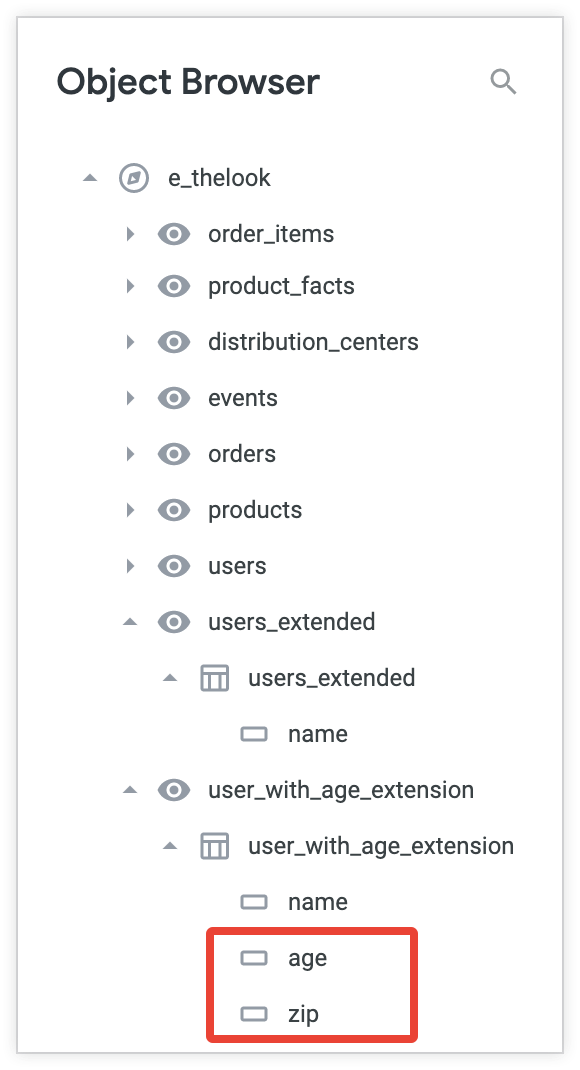 Wenn Ihr Projekt eine Ansicht oder ein Explore enthält, das eine andere Ansicht oder ein anderes Explore erweitert, können Sie im Bereich „Objektbrowser“ die LookML für das erweiternde Objekt aufrufen und dorthin navigieren. Wenn Sie eine Ansicht erweitern, die eine andere erweitert, werden im Bereich „Objektbrowser“ die Felder aus der Basisansicht sowie alle Felder angezeigt, die Sie in der erweiterten Ansicht hinzugefügt haben.