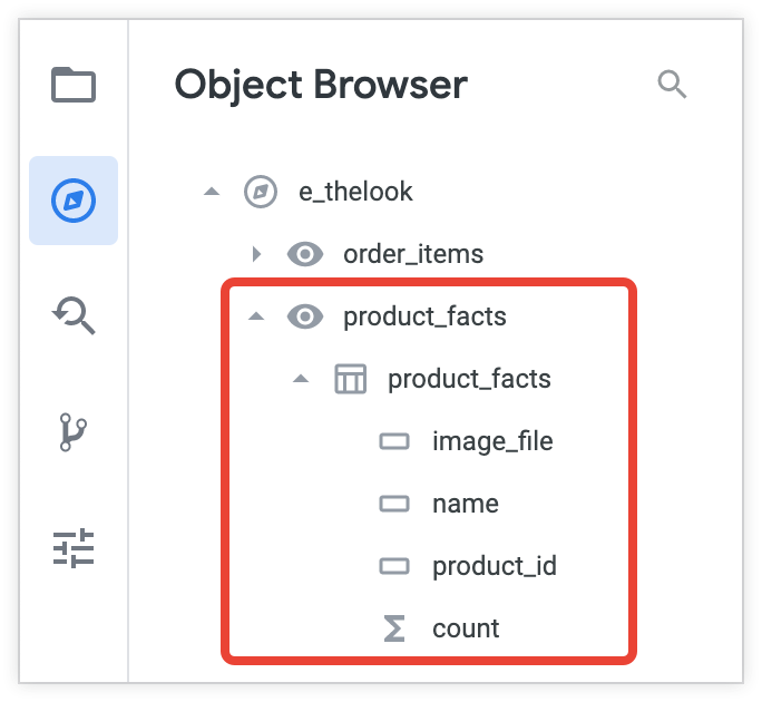 A continuación, puede ver la product_facts Exploración en el panel del navegador de objetos y desplegarla para ver las vistas y los campos que contiene.