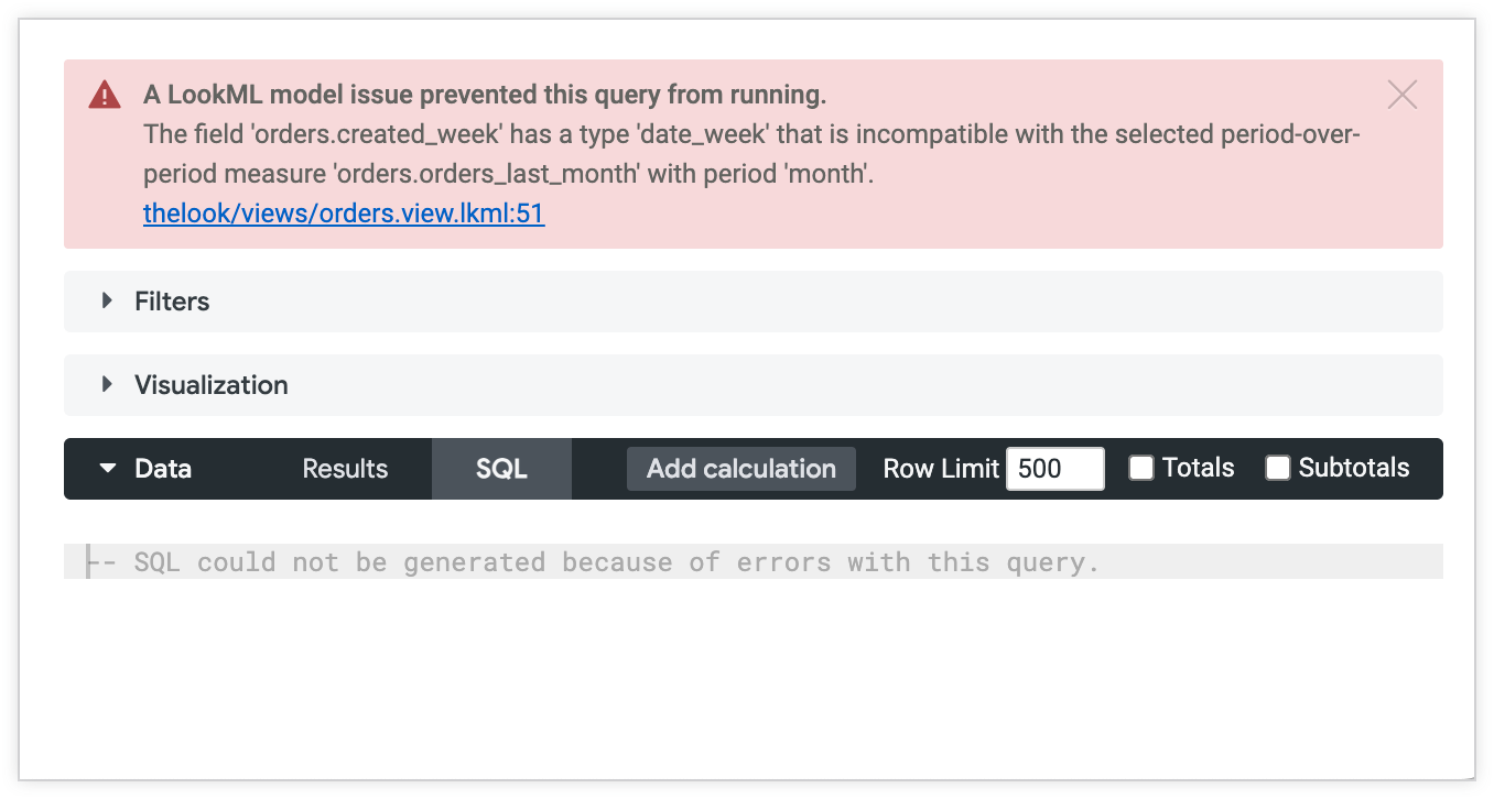 如果您运行的查询无法生成 SQL,探索窗口会返回一条错误消息,其中包含详细信息以及指向相关 LookML 的链接。