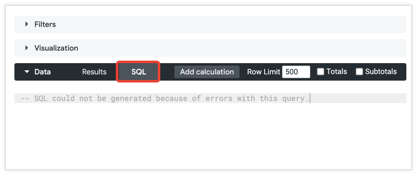 如果您想在探索中查看 PoP 指标支持哪些时间范围,可以测试不同的时间范围,而无需运行查询。点击探索的数据部分的 SQL 标签页,然后从探索的字段选择器中添加字段和过滤条件。如果 PoP 指标无法使用所选字段和过滤条件计算查询,SQL 标签页会显示一条消息,指出无法生成 SQL。