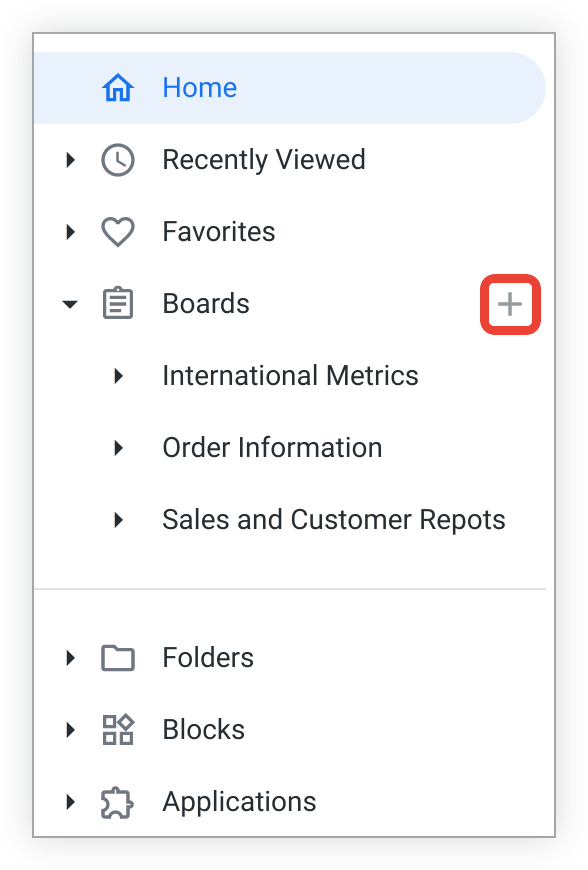 他のユーザーが作成したボードへのショートカットを作成するには、[Favorites] セクションと同じように、ボードの個人用リストにそのボードを追加します。ボードをリストに追加すると、Looker でコンテンツを閲覧したときに、左側のサイドバーの [Boards] の下にそのボードが表示されます。