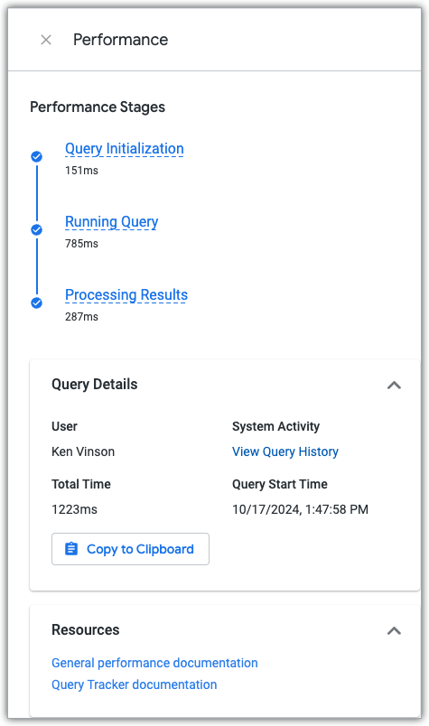 「效能」面板會顯示查詢在三個查詢階段中花費的時間,並提供效能說明文件和「查詢記錄」系統活動資訊主頁的連結,其中會顯示查詢和用於建立查詢的探索的目前和歷來效能資料。