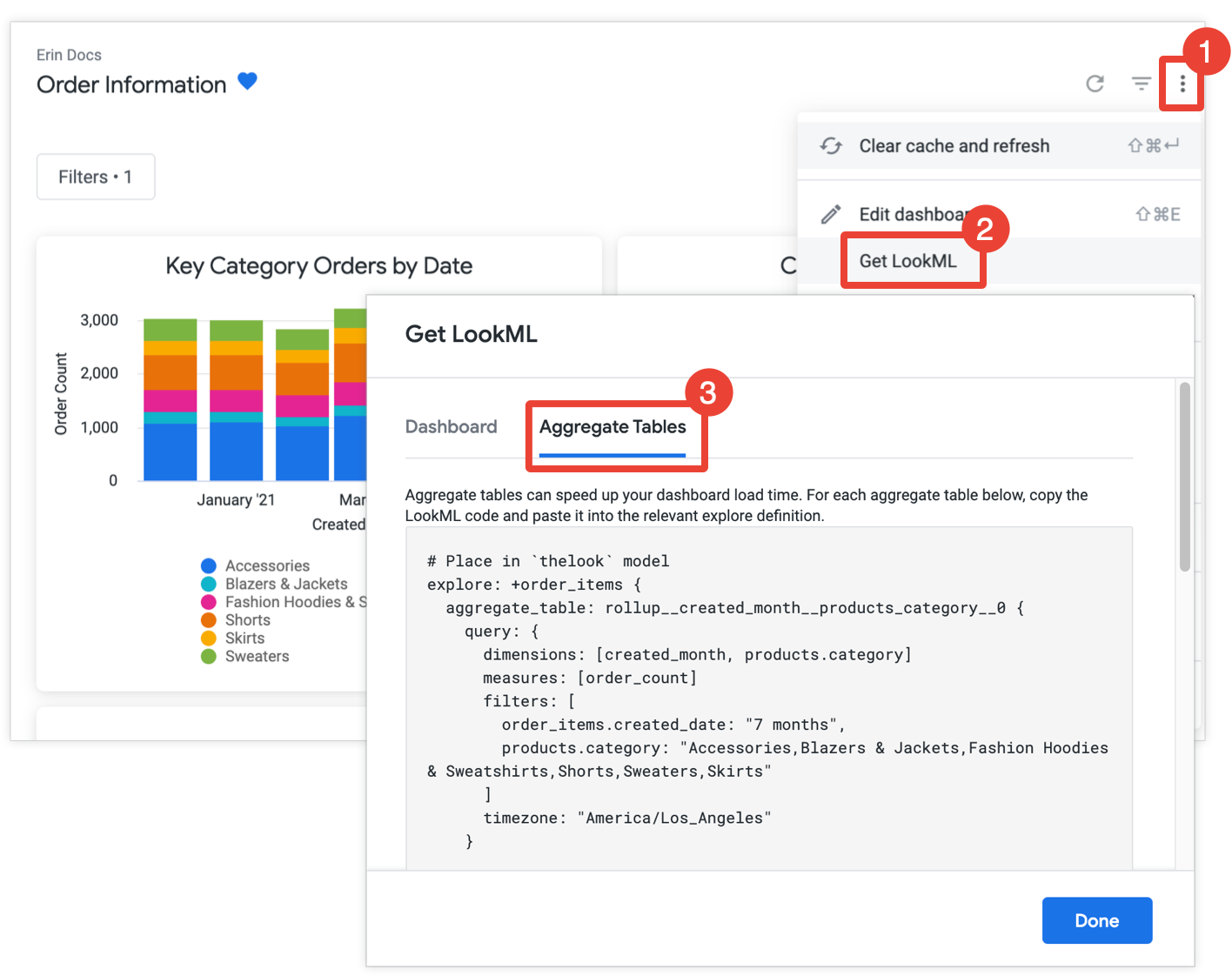 If you have develop permission, you can get the LookML to create aggregate tables for a dashboard by opening the dashboard, selecting Get LookML from the dashboard's three-dot menu, and choosing the Aggregate Tables tab: