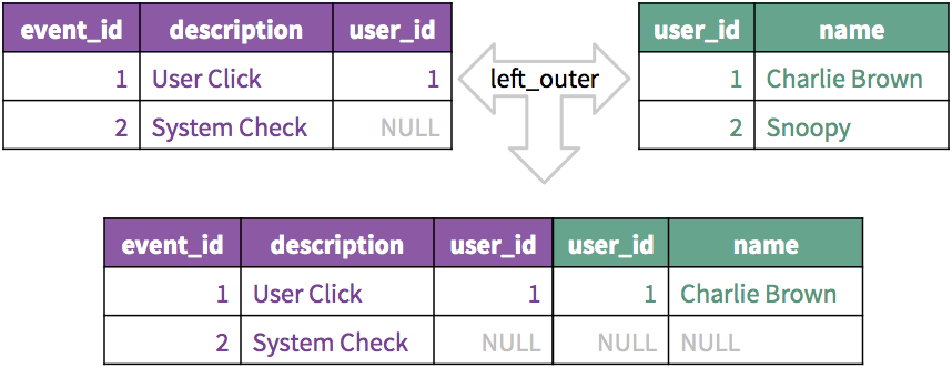 The most common join type in Looker is left_outer (the reason for its frequent use is described in the left_outer join types are usually preferred section on this page). You may know it from SQL as a LEFT JOIN. When you use this type, all rows from the Explore are included and data from the joined view is brought in, if available.