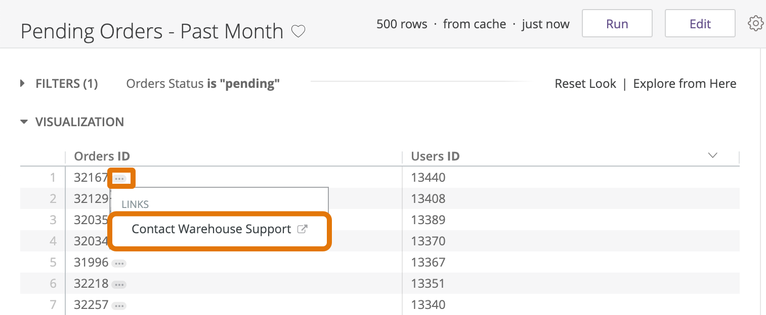 In the Look, the user will see the Contact Warehouse Support link among the options in the link menu, accessed by clicking the three-dot menu for any of the values of the Orders ID field.
