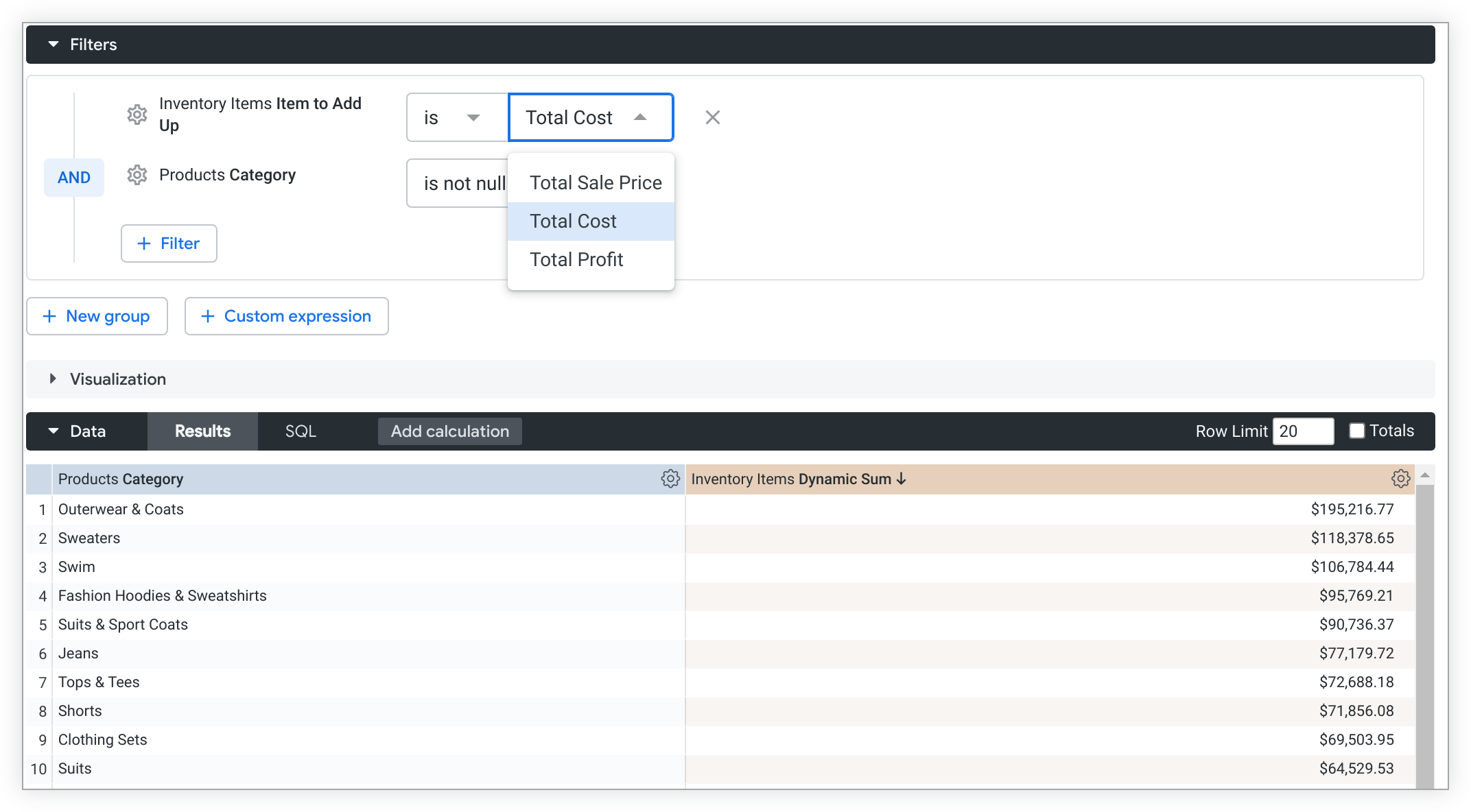 In this example, we create a parameter named item_to_add_up that lets a user choose what database column they want to sum — sale_price, cost, or profit: