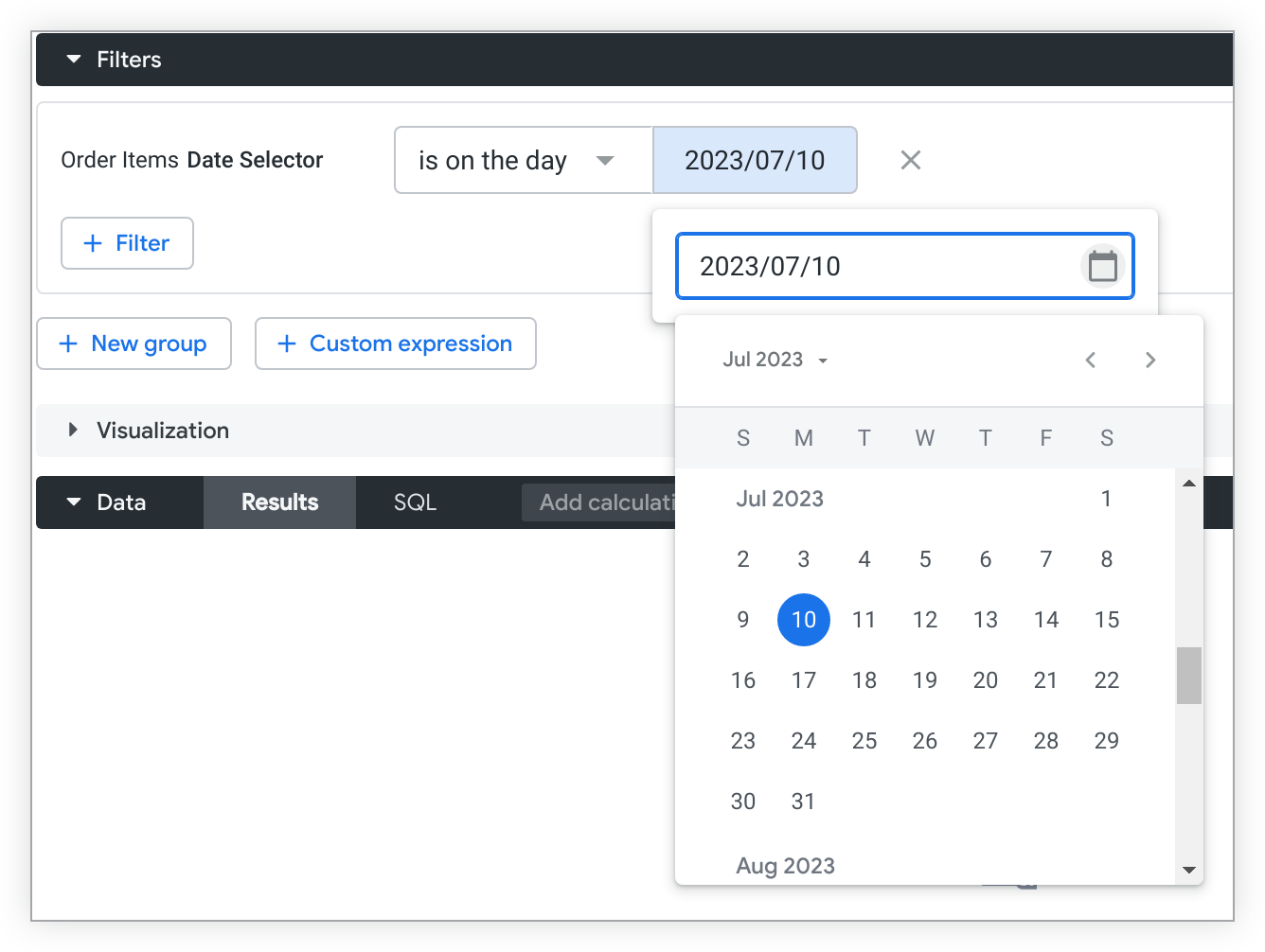 A date_time type parameter lets users select a specific date in a filter. The deepest granularity available is YYYY/MM/DD. Users can select only one date filter value, and the filter condition can be set to either is on the day to select a date, or matches a user attribute to select a date/time user attribute.