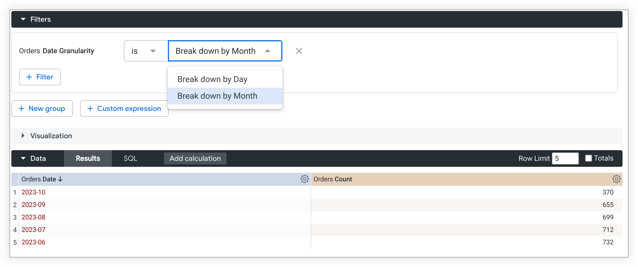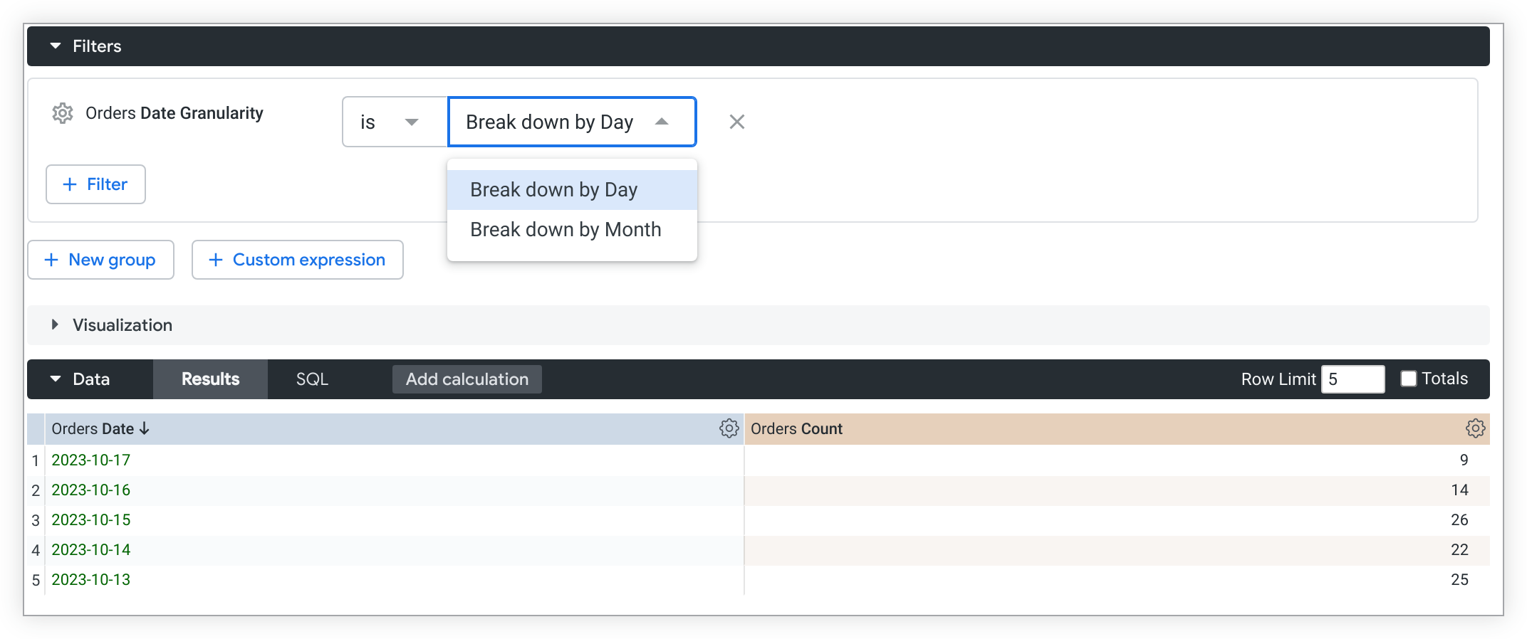 The following LookML block creates a parameter named date_granularity. Then, the sql parameter of a dimension uses parameter_name._parameter_value{% if %}{% elsif %}{% endif %}parameter: