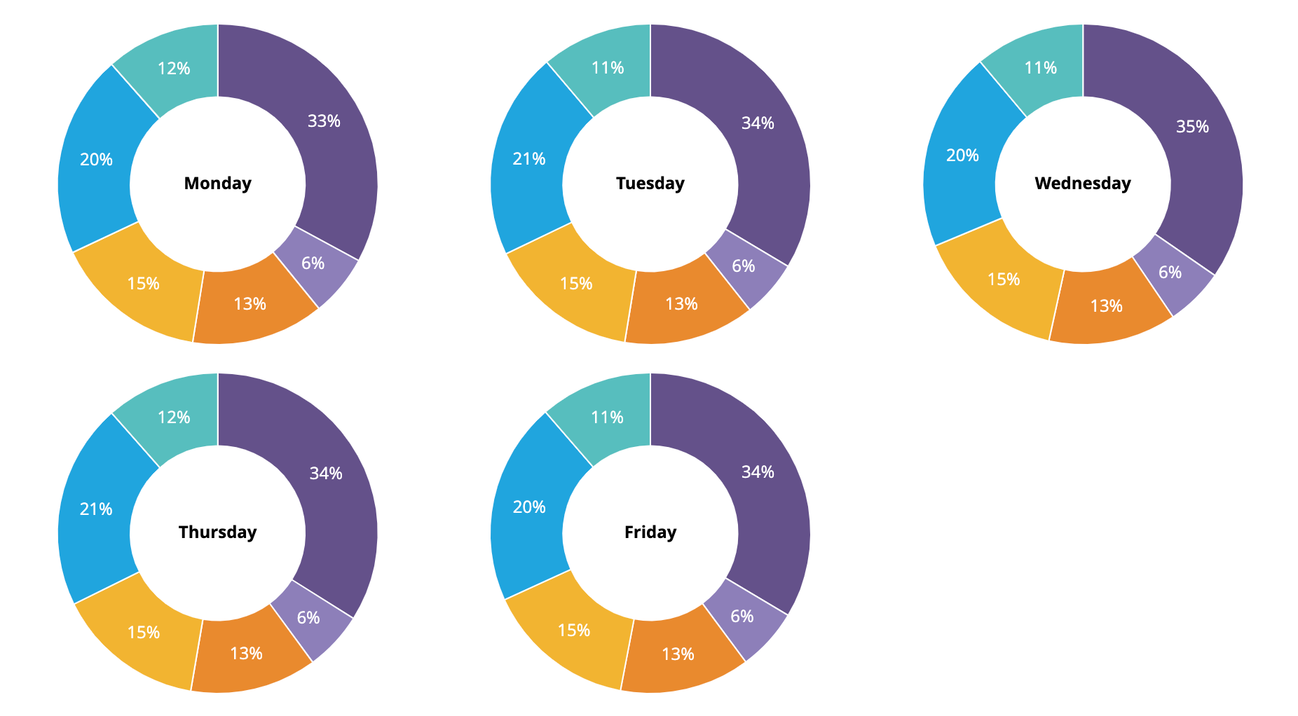 Elements of type: looker_donut_multiples require one regular dimension, one pivoted dimension, and one measure. Each value of the regular dimension defines the donuts, and each value of the pivoted dimension defines the slices.