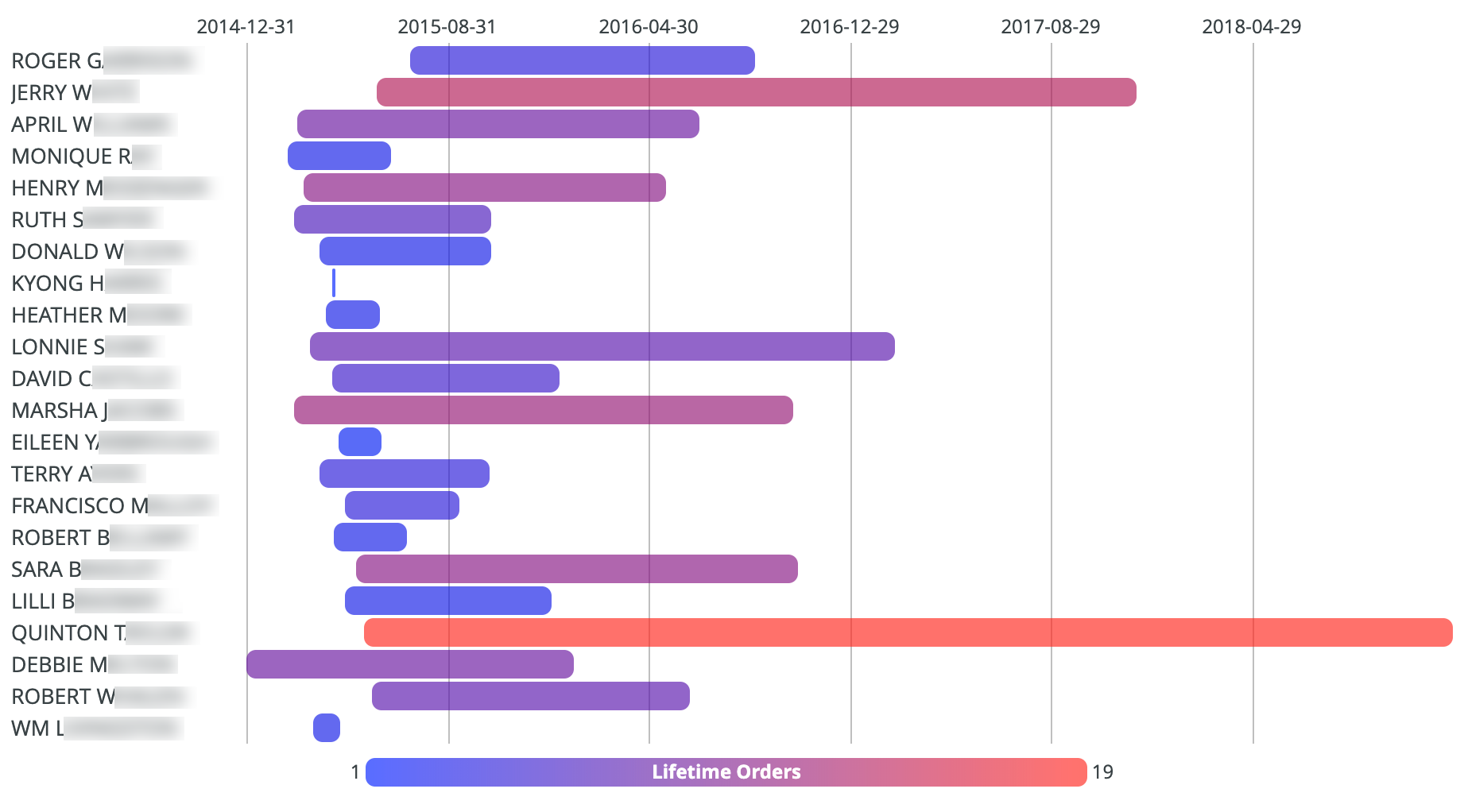 To create an element of type: looker_timeline, your query must include values for the dimensions and measures parameters, including at least one dimension representing the label field, such as a name, as well as a start field and an end field, which can be a date or number. See the Timeline chart options documentation page for more information about the minimum requirements for creating timeline charts in Looker.