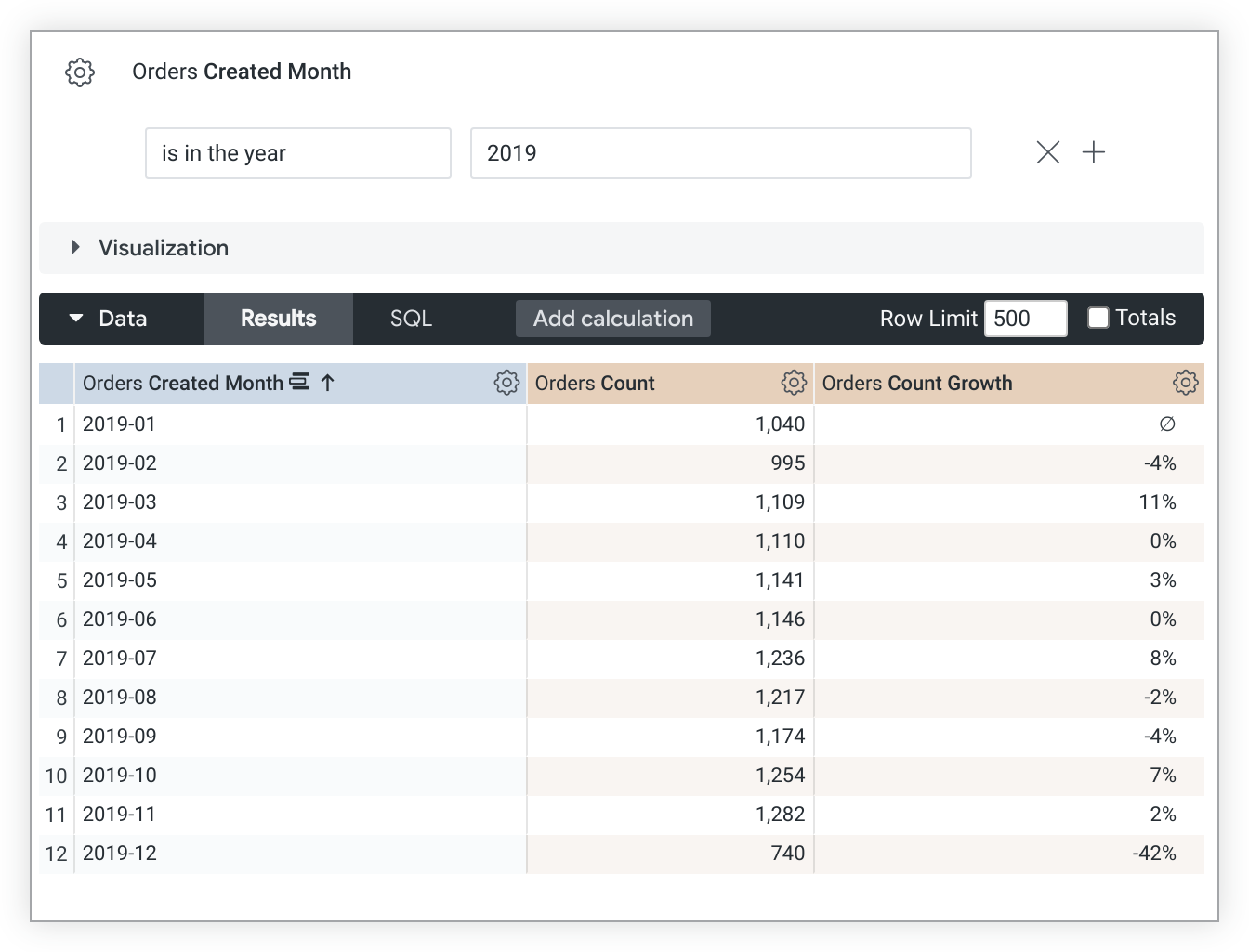 Note that running_total values depend on sort order. If you change the sort, you must re-run the query to re-calculate the running_total values. In cases where a query is pivoted, running_total runs across the row instead of down the column. If this is not what you want, add direction: "column" to the measure definition.