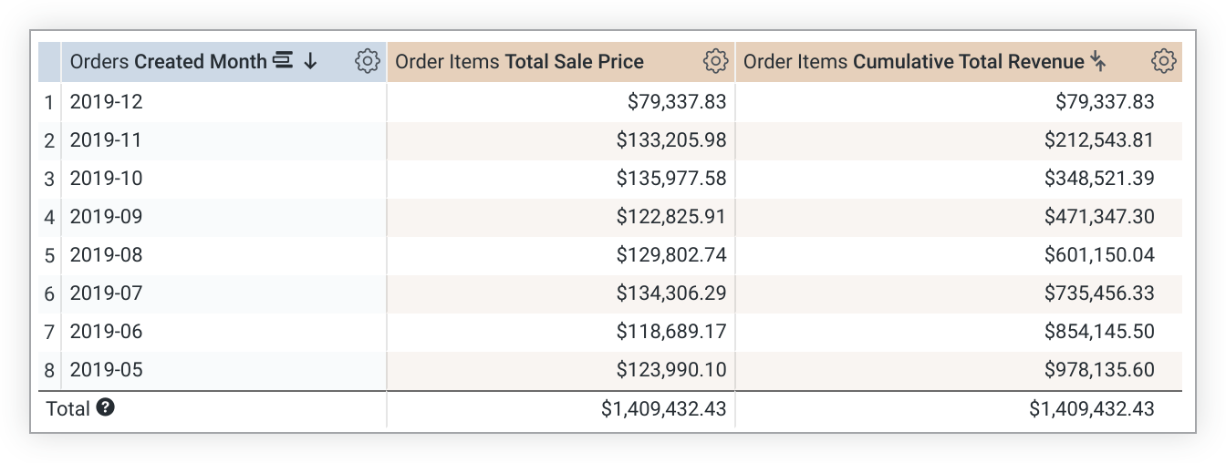 The following LookML example creates a cumulative_total_revenue measure that is based on the total_sale_price measure: