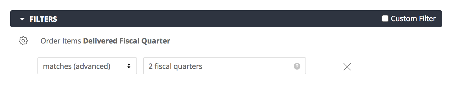 fiscalin your filter expression for the quarter(s) or year(s). For example:2 fiscal quarters.
