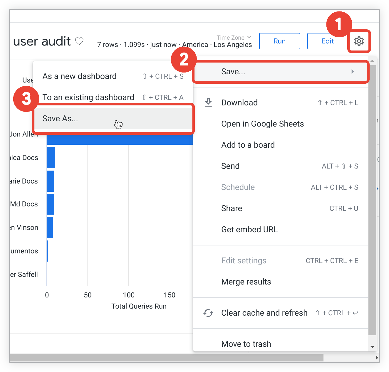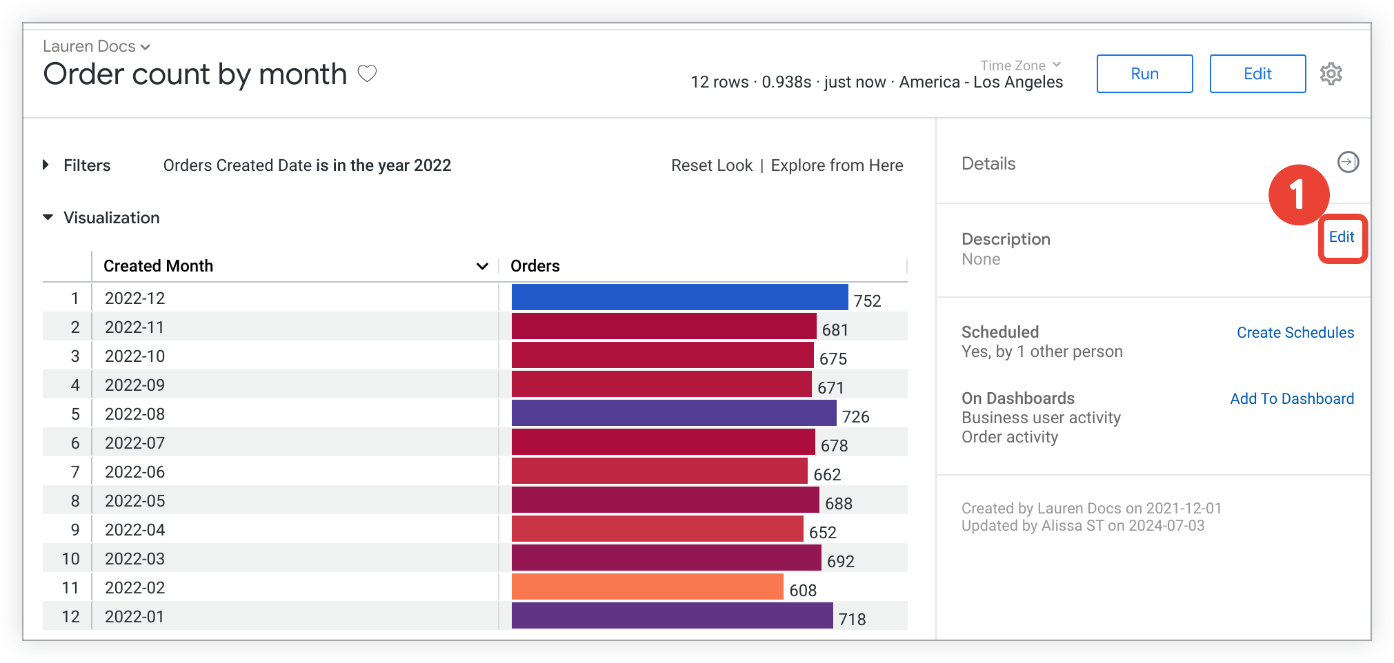 Dopo aver creato un look, puoi modificare la query sottostante, il nome e decidere se deve essere eseguito automaticamente al caricamento. Se disponi dell'autorizzazione, puoi anche concedere l'accesso ai look tramite URL pubblicamente accessibili, descritti in modo più dettagliato nella pagina della documentazione relativa a condivisione pubblica, importazione e incorporamento dei look.