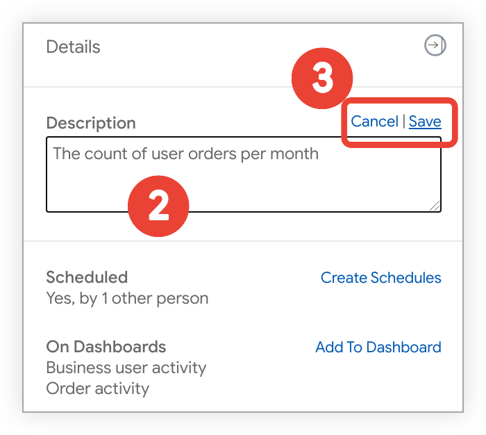 3. Seleziona Salva per salvare la descrizione aggiornata oppure Annulla per chiudere la casella di testo Descrizione senza salvare.