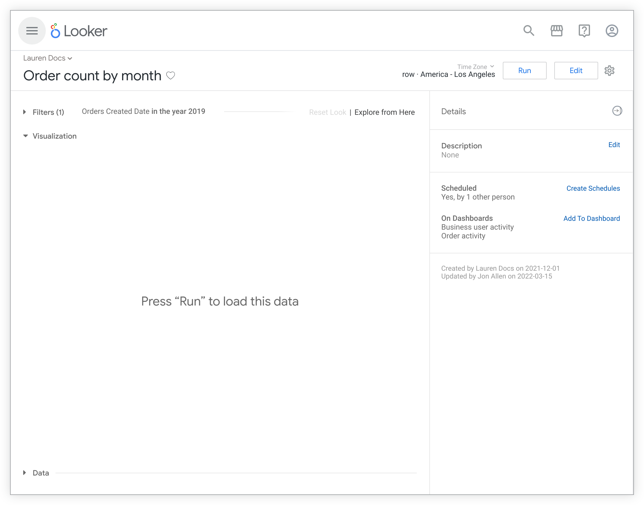 Se scegli di impedire l'esecuzione automatica del look, gli utenti vedranno una visualizzazione vuota con il testo Premi "Esegui" per caricare questi dati quando visualizzano inizialmente il look.