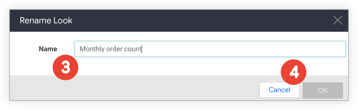 2. Inserisci il nome desiderato nel campo del titolo sotto l'intestazione del menu Modifica look. In questo esempio, il titolo del look "Conteggio ordini per mese" è stato modificato in "Conteggio ordini mensili".