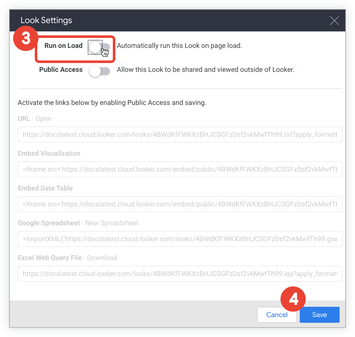 After creating a Look, you can edit its underlying query, edit its name, and decide if it should automatically run when loaded. If you have permission to do so, you can also give access to the Look through publicly accessible URLs, described in more detail on the Public sharing, importing, and embedding of Looks documentation page.