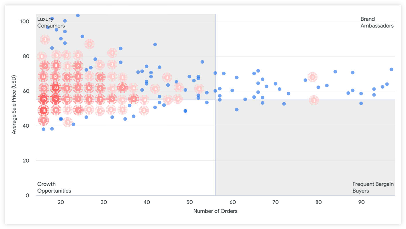 Opsi Petakan Kuadran memungkinkan Anda membagi diagram sebar menjadi empat kuadran. Jika Anda mengaktifkan opsi Petakan Kuadran untuk visualisasi diagram sebar, Anda dapat menyesuaikan batas setiap kuadran, serta warna latar belakang dan label untuk setiap kuadran. Dalam contoh diagram sebar berikut, pengguna disegmentasikan berdasarkan kolom Jumlah Pesanan dan Harga Jual Rata-Rata (USD) ke dalam kategori Konsumen Mewah untuk kuadran pertama, Brand Ambassador untuk kuadran kedua, Peluang Pertumbuhan untuk kuadran ketiga, dan Pembeli yang Sering Mendapatkan Penawaran untuk kuadran keempat.