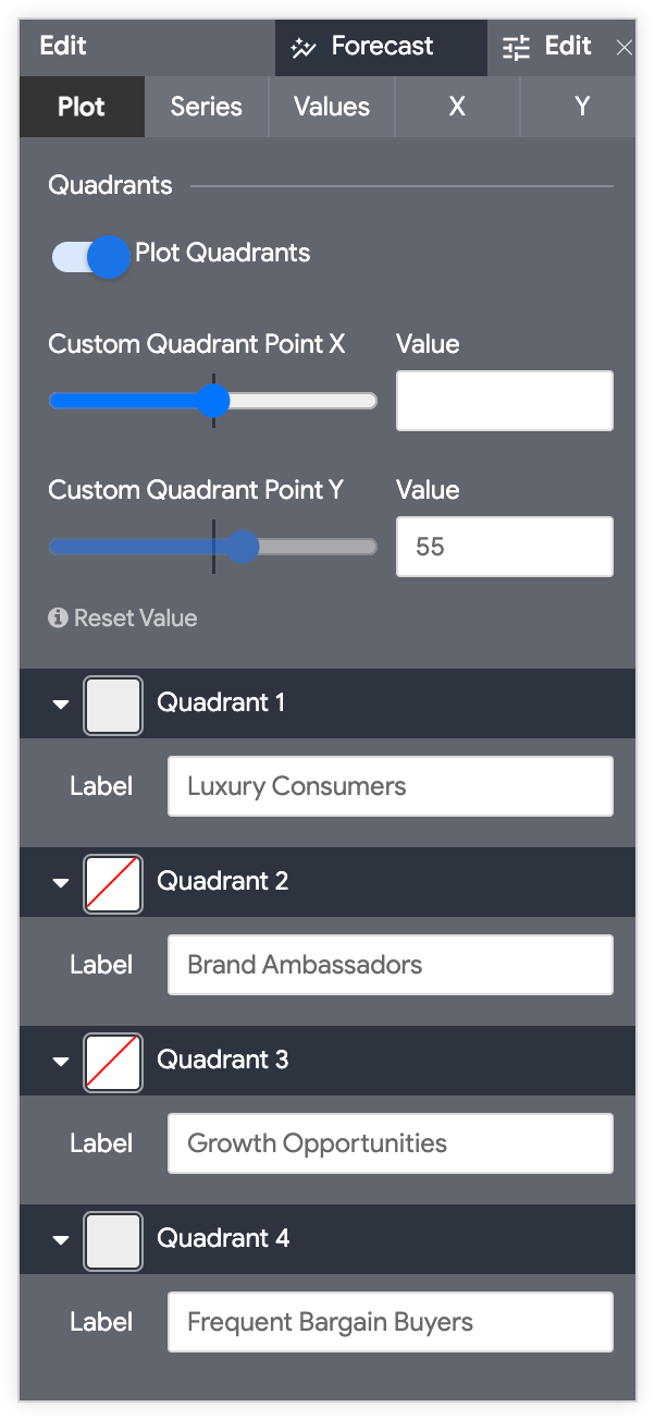 - Titik Kuadran Kustom X: Gunakan penggeser untuk menentukan lokasi garis batas vertikal. Atau, Anda dapat memasukkan nilai numerik dari kolom yang diplot pada sumbu x di kolom Nilai untuk menetapkan garis batas vertikal ke lokasi titik tertentu pada sumbu x. Lokasi default untuk garis batas adalah pusat sumbu x.