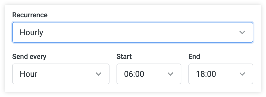 As opções de sincronização variam consoante a opção escolhida. Por exemplo, as definições Por hora incluem uma hora de Início e uma hora de Fim. O Looker envia o fornecimento a cada hora, começando na hora de início e terminando na hora de fim.