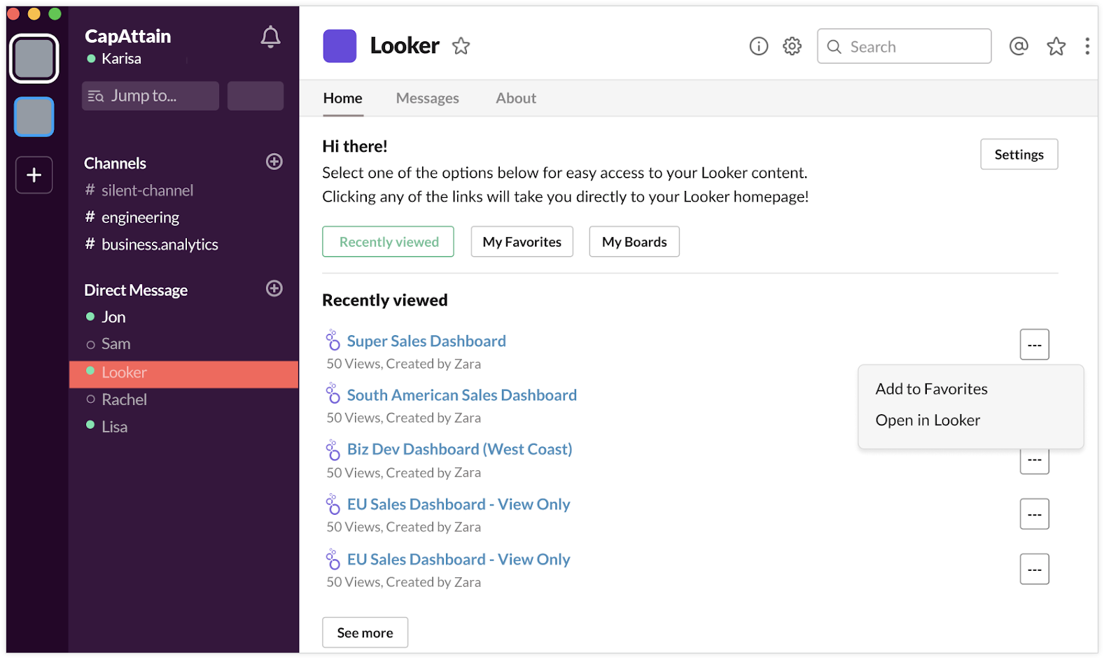 Para conferir uma lista dos seus conteúdos e pastas favoritos do Looker no Slack, clique na guia Início no app.