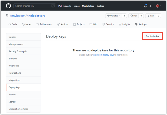 7. Di tab Settings GitHub, di halaman Deploy keys, pilih tombol Add deploy key: