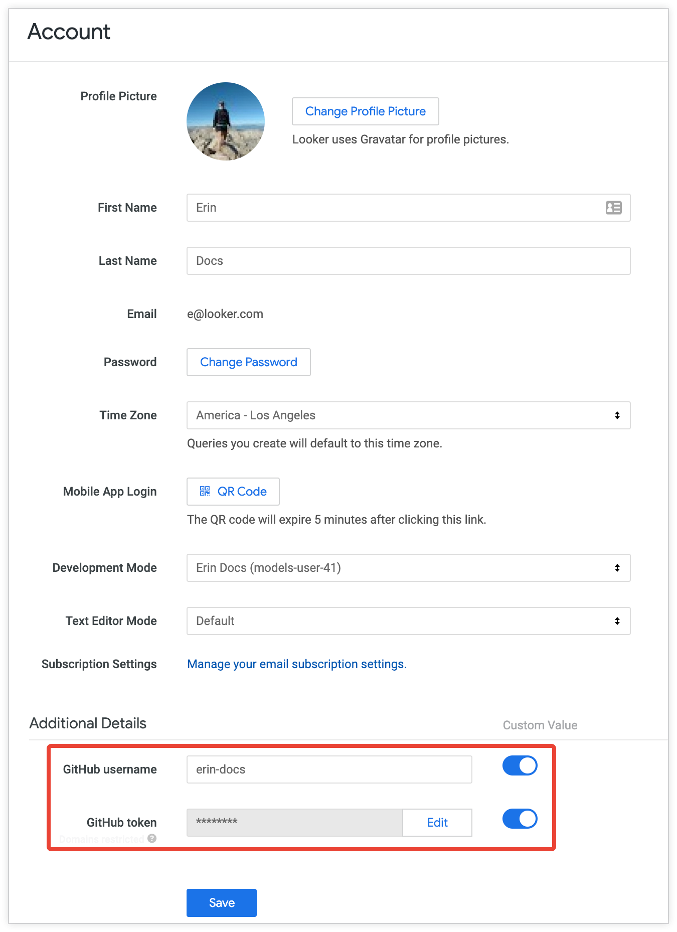 次の例は、ユーザーがユーザー属性フィールドに Git 認証情報を入力した Looker ユーザーの [アカウント] ページを示しています。