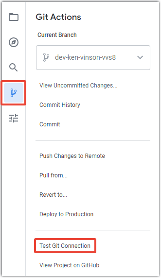 [Git actions] パネルで [Test Git Connection] を選択して、Git 接続テストツールにアクセスすることもできます。