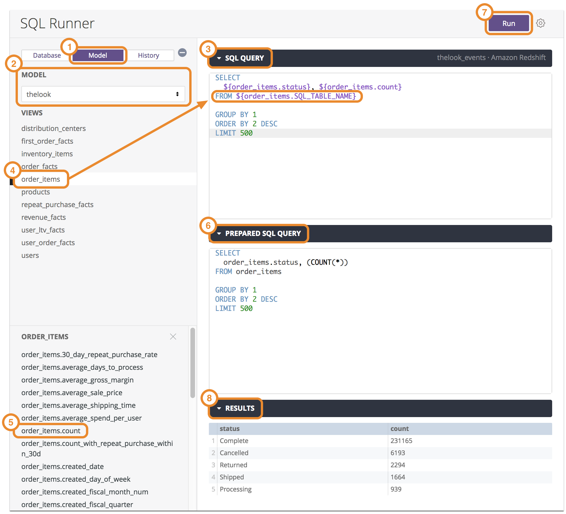 Mit SQL Runner können Sie SQL-Abfragen für ein LookML-Modell schreiben und ausführen, anstatt sie direkt für Ihre Datenbank auszuführen. Wenn Sie eine Abfrage für ein Modell erstellen, können Sie LookML-Ersetzungsoperatoren wie ${view_name.field_name} oder ${view_name.SQL_TABLE_NAME} verwenden. Das kann Zeit sparen, wenn Sie beispielsweise eine Abfrage zum Beheben von Problemen mit einer abgeleiteten Tabelle erstellen.