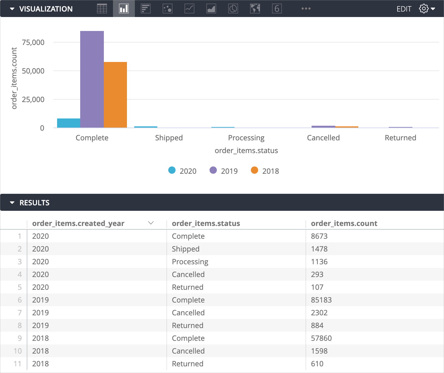 Se l'amministratore di Looker ha attivato la funzionalità di Labs Visualizzazioni di SQL Runner, puoi creare visualizzazioni direttamente in SQL Runner.